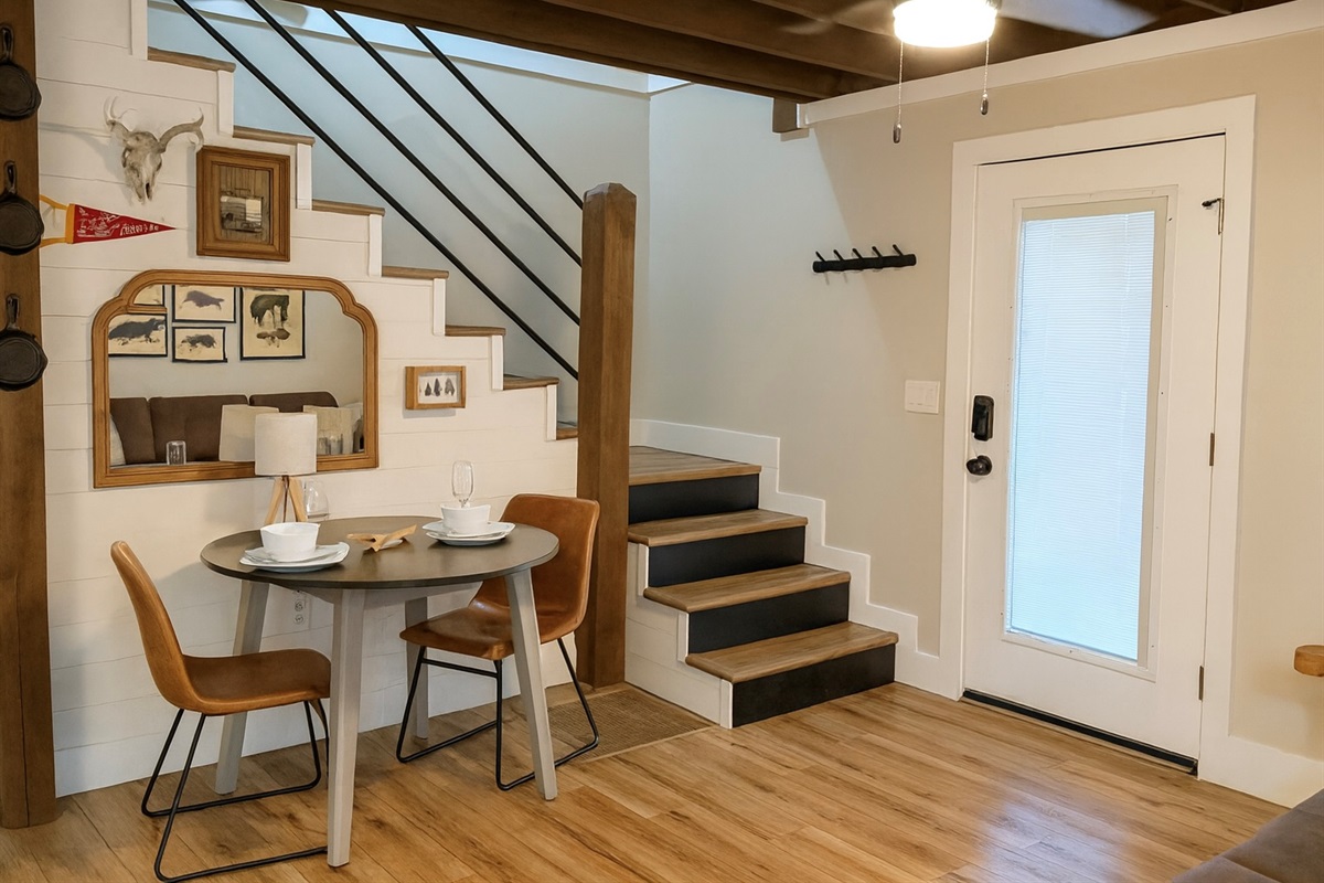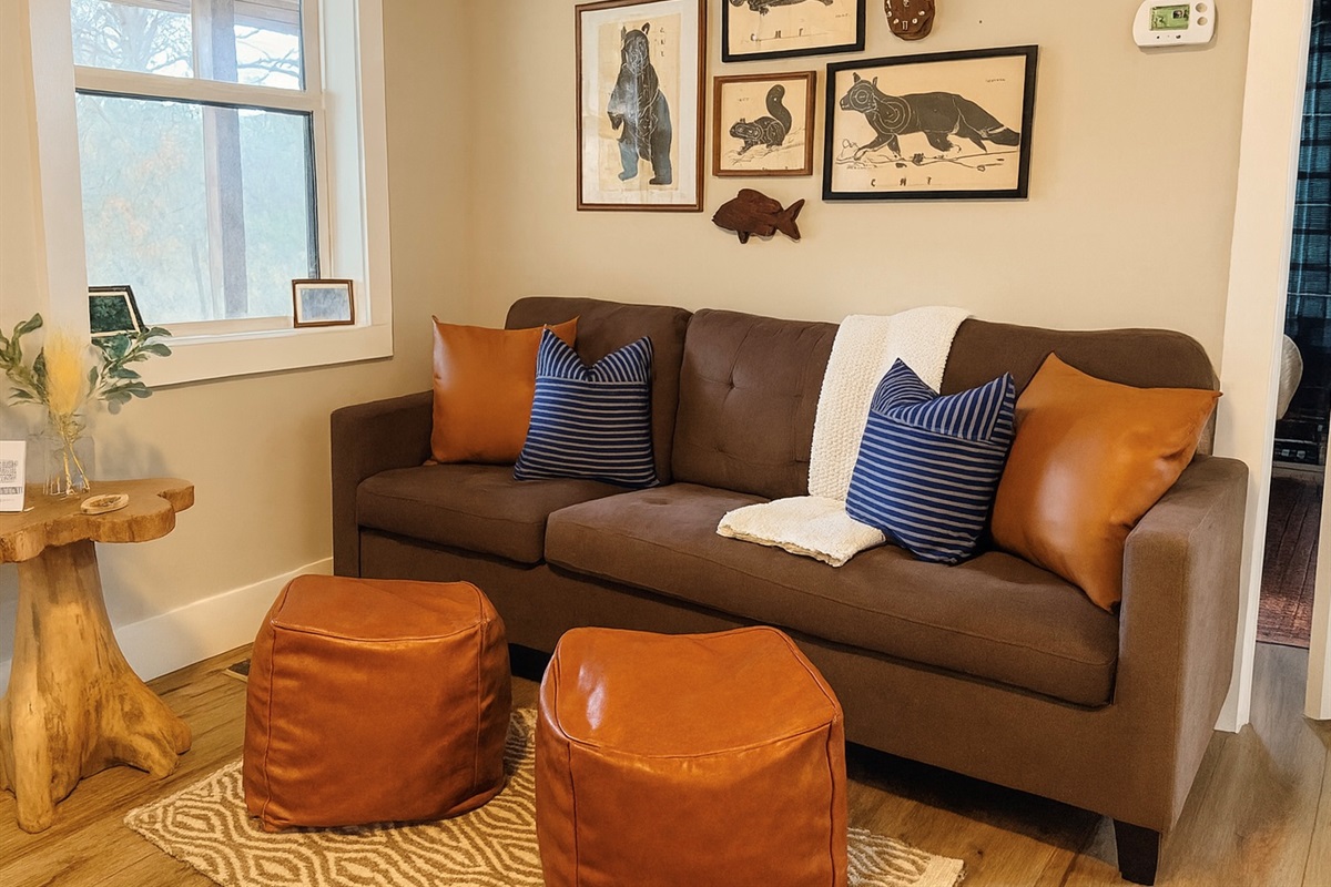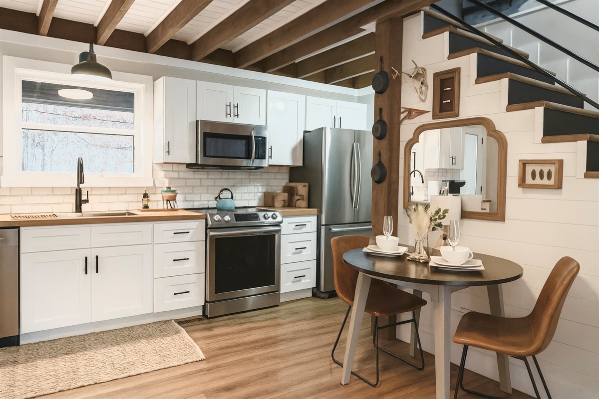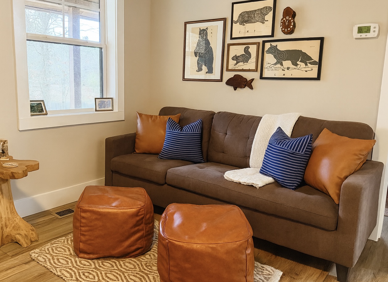 Inside, the cabin features warm, rustic charm with thoughtful modern updates. The main level includes a comfortable primary bedroom and full bathroom, along with a newly renovated kitchen boasting butcher-block countertops, a farm sink, modern appliances, and Lodge cast iron cookware. A washer and dryer are conveniently tucked nearby. Upstairs, a spacious loft includes two queen beds, a pull-out couch, smart TV, and two desks ideal for remote work or creative projects. The cabin sleeps six comfortably and is designed for both relaxation and adventure.