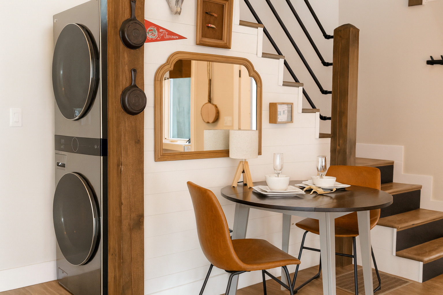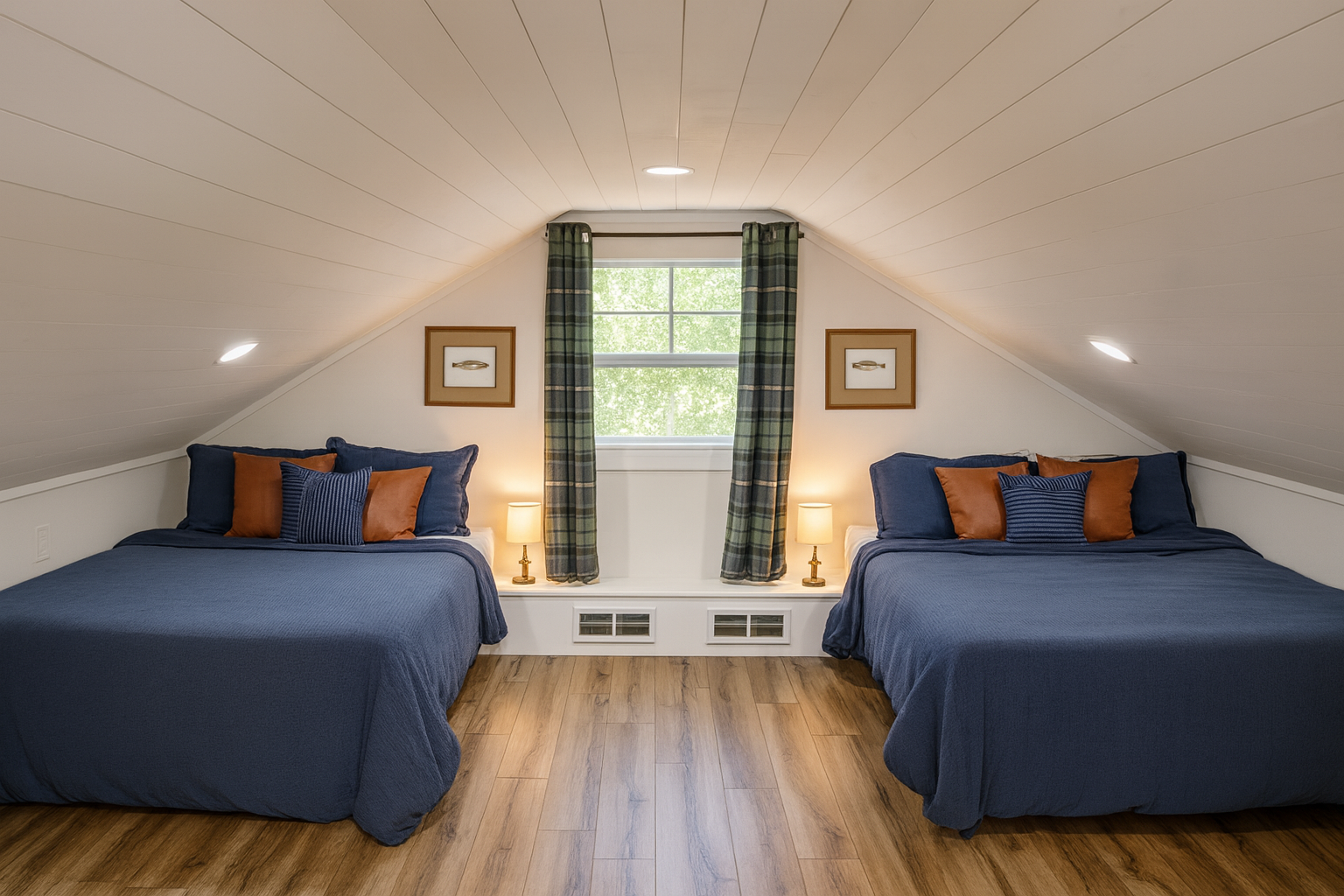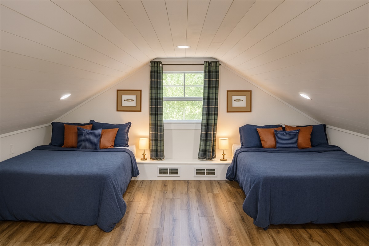 Inside, the cabin features warm, rustic charm with thoughtful modern updates. The main level includes a comfortable primary bedroom and full bathroom, along with a newly renovated kitchen boasting butcher-block countertops, a farm sink, modern appliances, and Lodge cast iron cookware. A washer and dryer are conveniently tucked nearby. Upstairs, a spacious loft includes two queen beds, a pull-out couch, smart TV, and two desks ideal for remote work or creative projects. The cabin sleeps six comfortably and is designed for both relaxation and adventure.