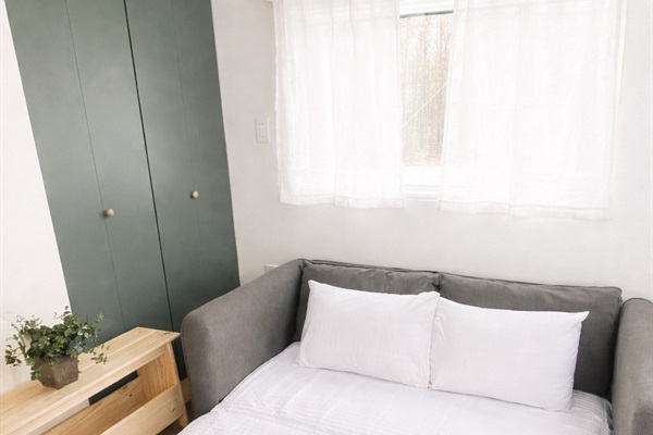 Inside, the cabin offers a warm and inviting space with thoughtful comforts throughout. The bedroom with a queen bed creates a restful place to unwind after a day exploring the park, while the living area and fully equipped kitchen make it easy to enjoy quiet mornings and laid-back evenings. The sofa transforms into a bed for kids, friends, or an additional couple to comfortably sleep.