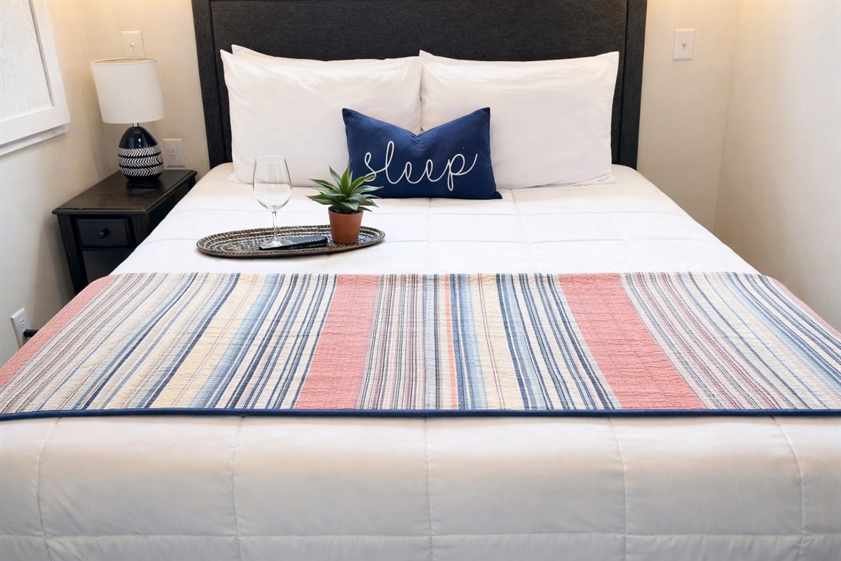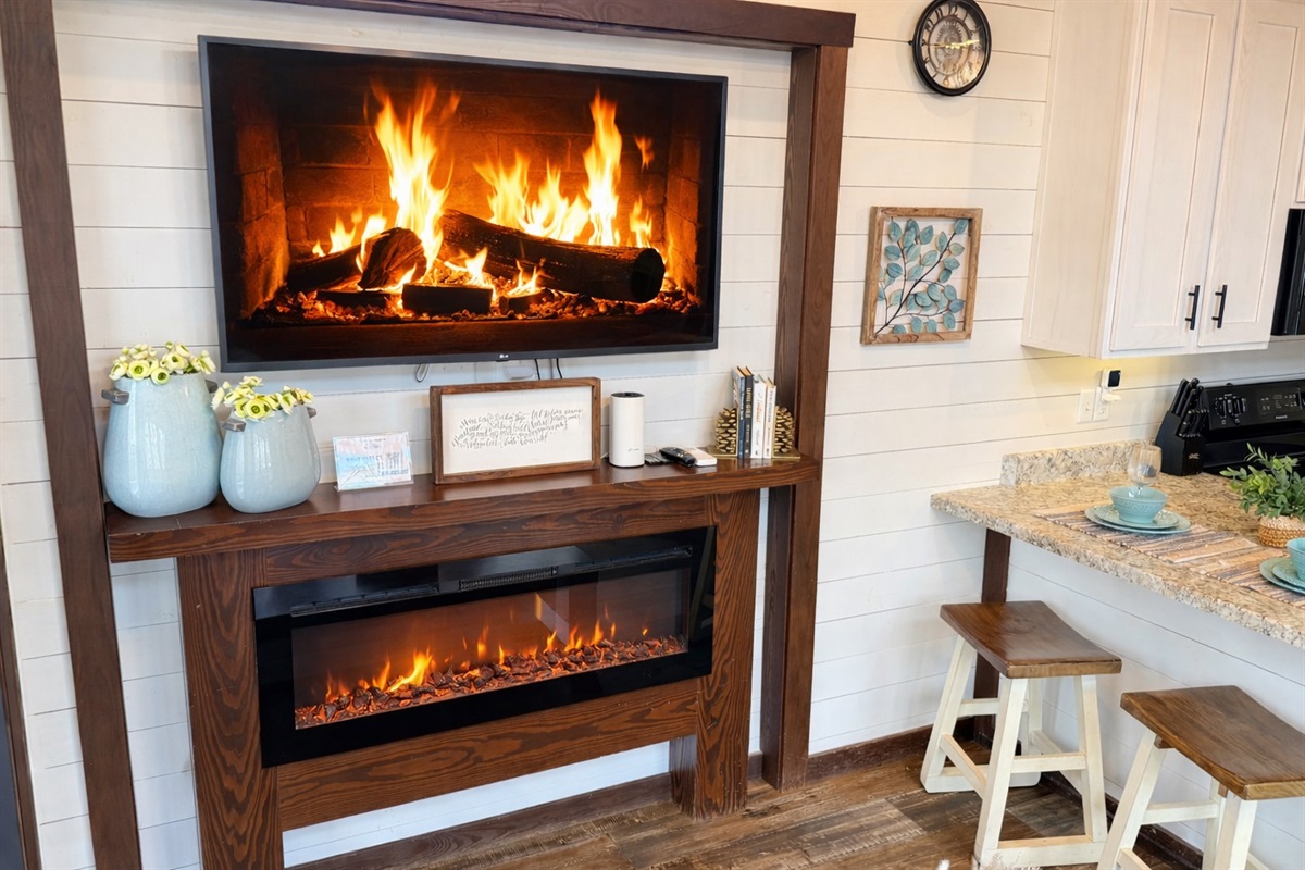 The living area is cozy and comfortable with a fireplace and flat-screen TV, while the fully stocked kitchen makes meals easy during your stay. A washer and dryer add convenience for longer visits.