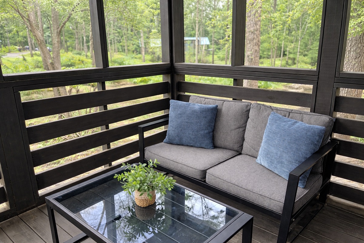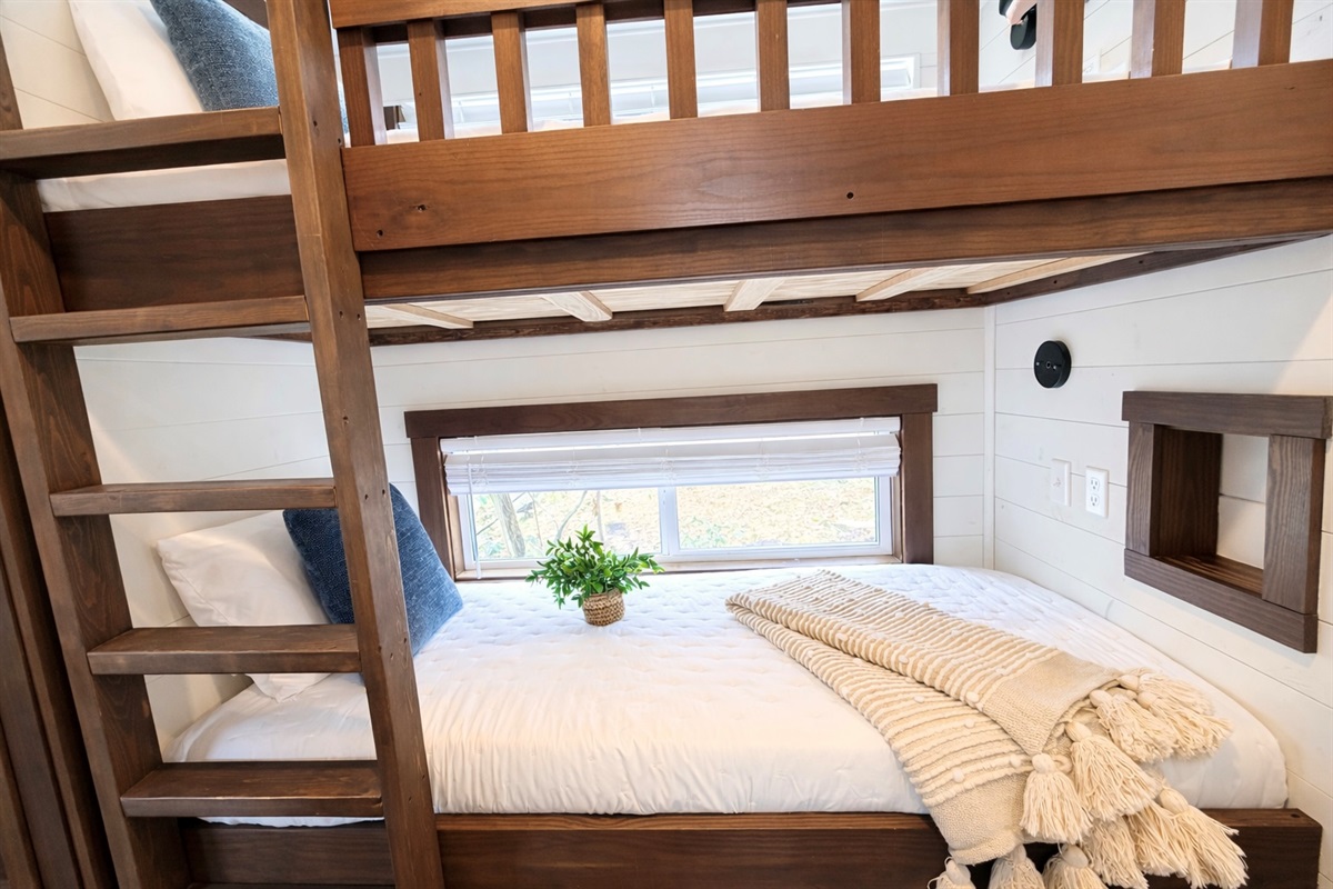 Inside the home offers a warm and inviting layout designed for comfort after a day outdoors. The main bedroom features a queen bed with direct access to a screened porch, ideal for morning coffee or evening relaxation. Additional sleeping areas include built-in bunk beds and a loft with twin mattresses, making this a great option for families, couples, or small groups.