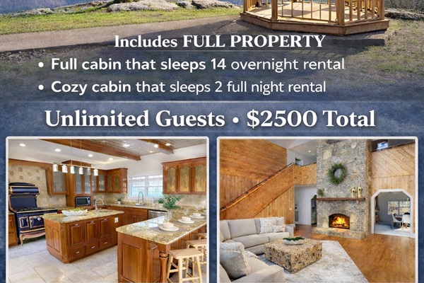 5 Bedrooms • 4 Bathrooms 4 Baths • Sleeps 2-14Set on 8 private acres, this large 5-bedroom home is designed to impress! Gather in the huge entertainer’s kitchen, challenge friends to a game on the pool table, sit by the crackling fireplaces or firepit, relax in the cozy greenhouse, or step outside to the expansive deck where the true “wow factor” awaits.