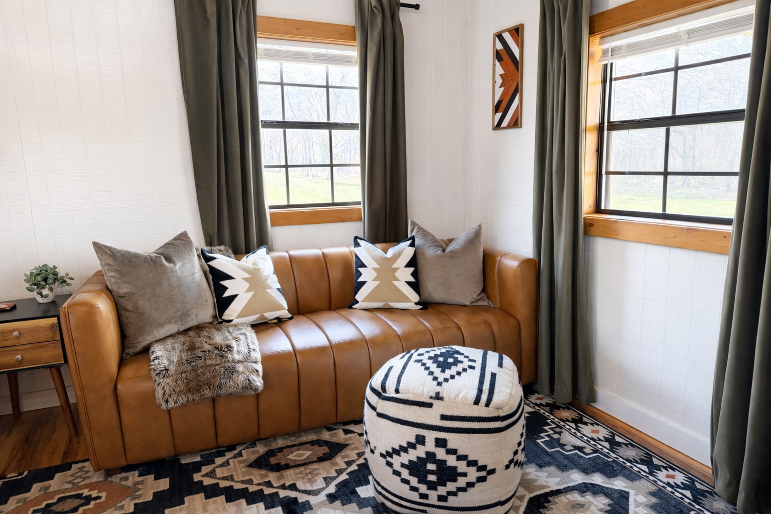 Enjoy a cup of coffee as the sun rises and fills the (Eastern facing) back porch with light. Inside the cabin you will find a queen bed and cozy living room area, outfitted with brand new queen mattress and couch. There is a full bathroom with shower and open kitchenette on the main floor.
