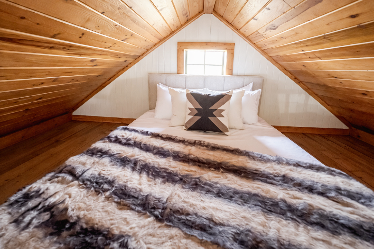 The loft space overlooks the living room and is accessible via ladder (watch your head) This cozy nook is the perfect spot to enjoy an evening listening to rain on the tin roof.
