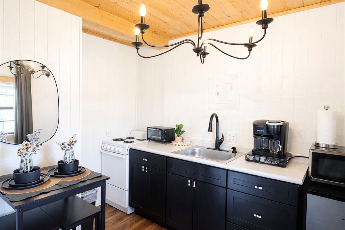 The kitchenette is outfitted with a stove, microwave, mini refrigerator, and basic cooking essentials.